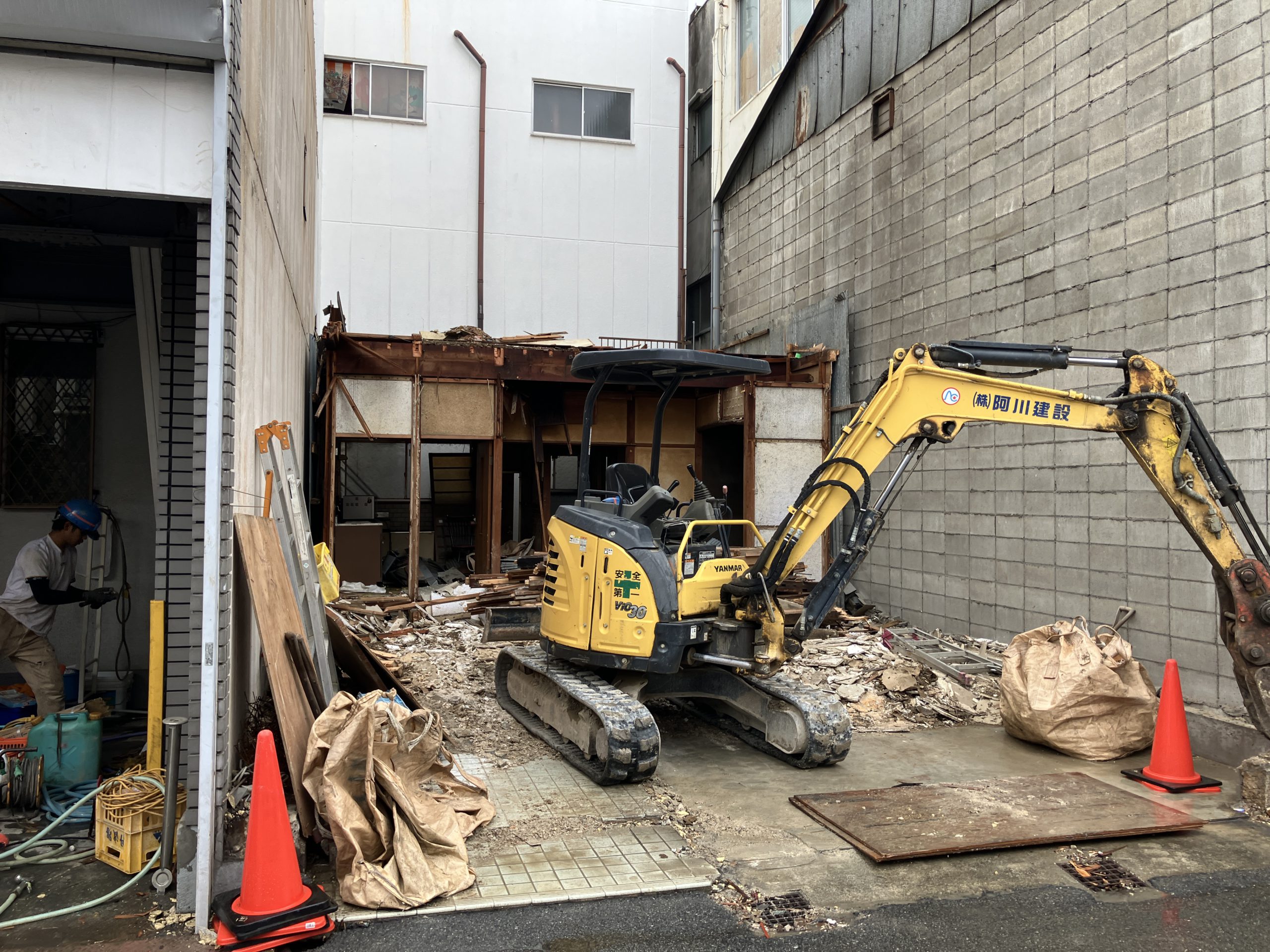 阿川建設二宮です。中央区の解体現場ですがようやく終わりが見えてきました!屋上に重機を上げて解体を進めてようやく基礎解体に入りました!隣地の建物との間も10センチぐらいしかなく養生や解体自体も時間がかかりました!基礎も隣りや歩道との間があまりなくて深さも深い基礎なので苦労