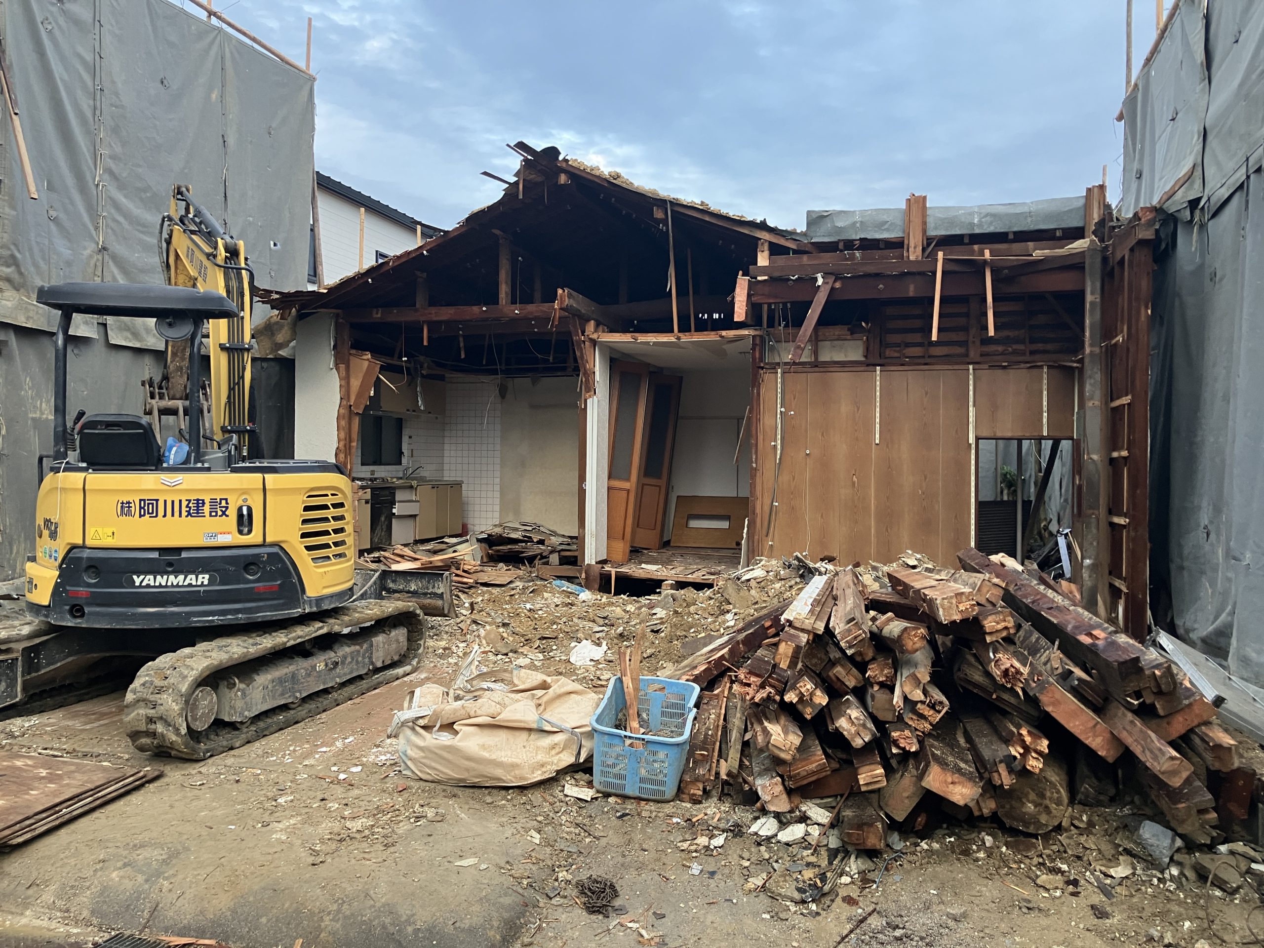 こんにちは、阿川建設、新本です。今回は、木造解体工事をしています。怪我、事故の無いよう、注意を払いながらの作業に、努めたいです。
