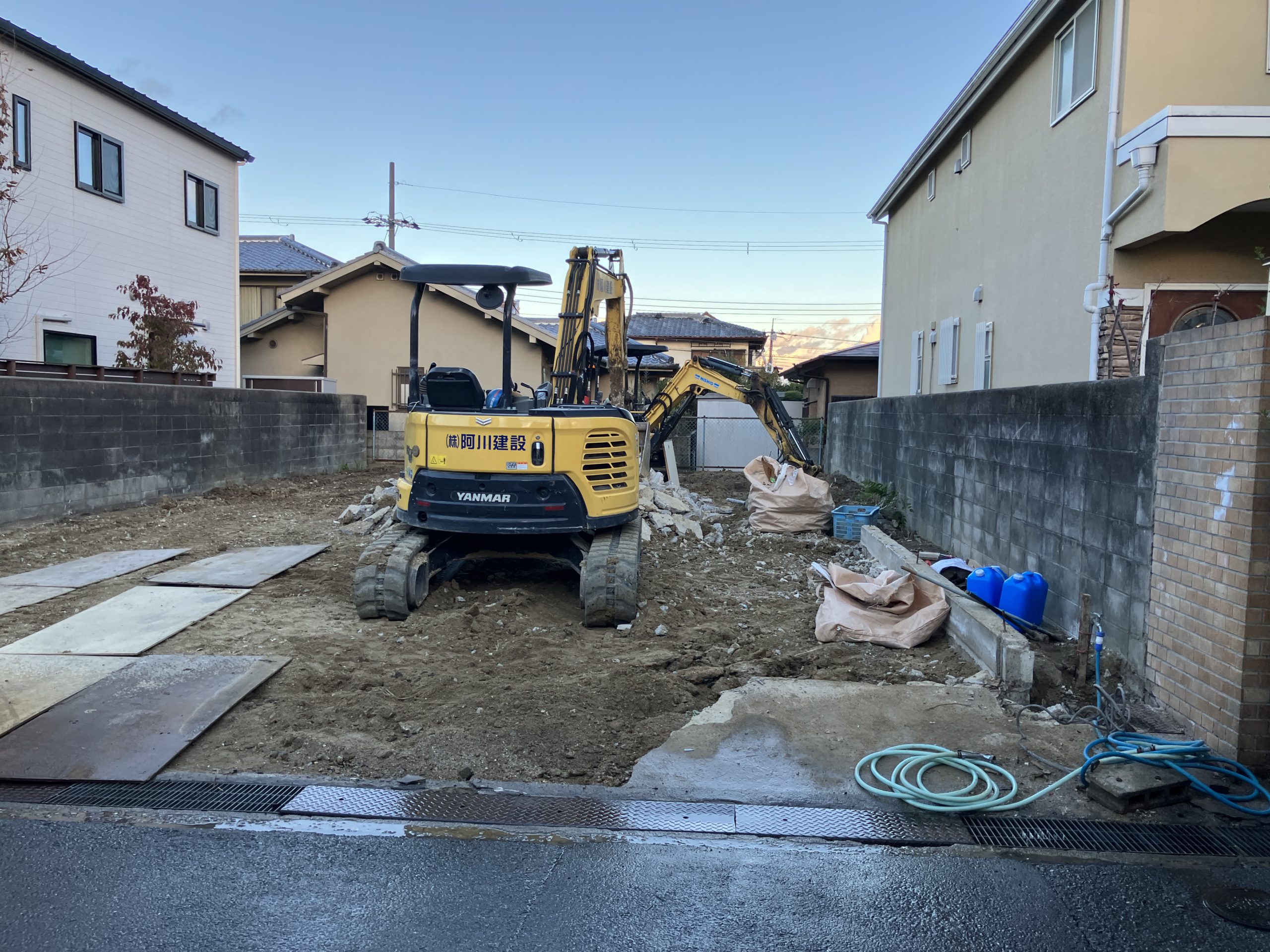 現在RCの基礎解体をしています。建物が建っている場所がかなりの高低差があるところで土をまくりながら基礎解体を進めています。安全に注意しながら作業致します!
