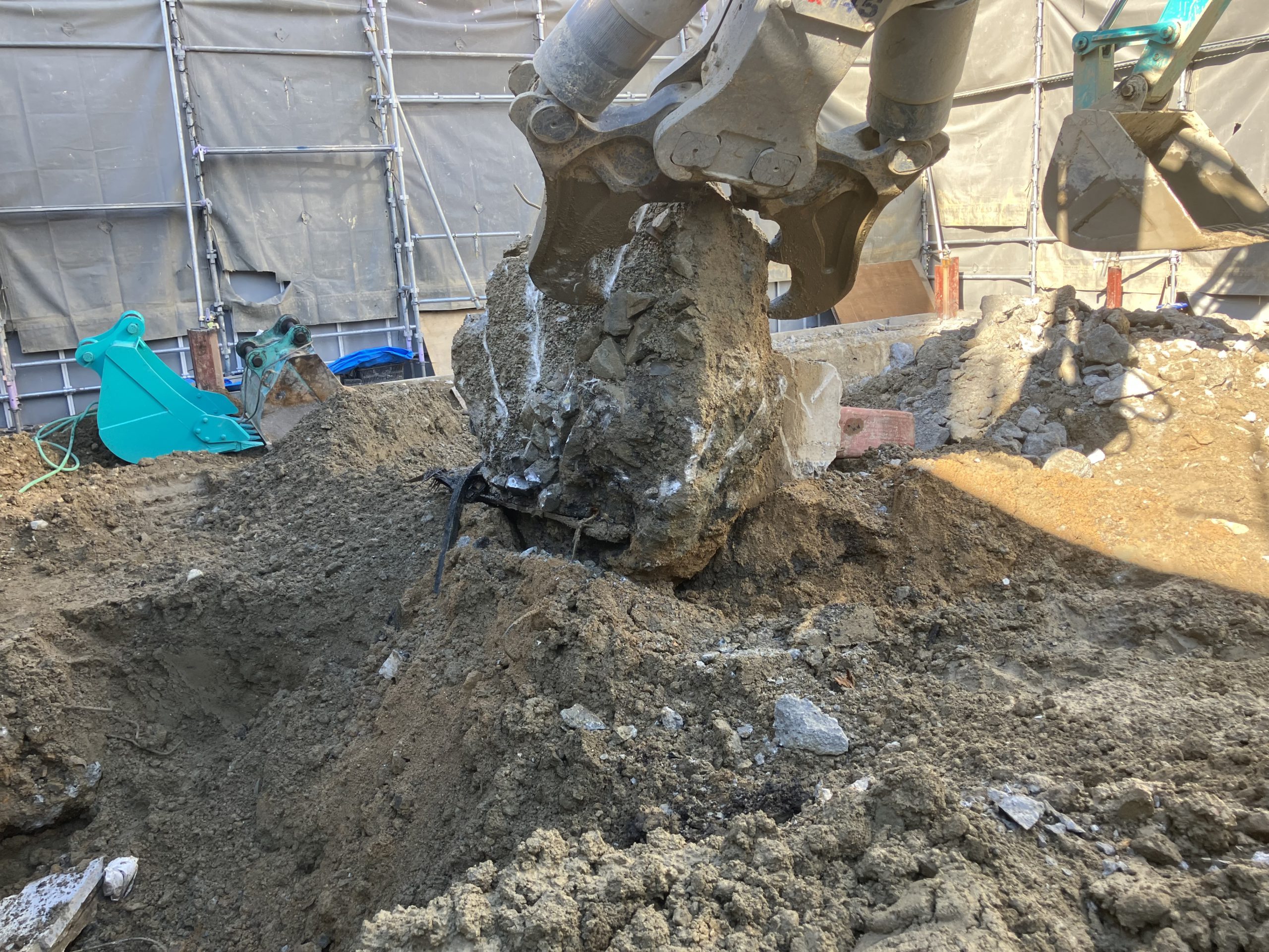 本日は、ブレーカーを装備した3トンヤンマー油圧ショベルを用いて、建物