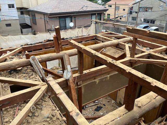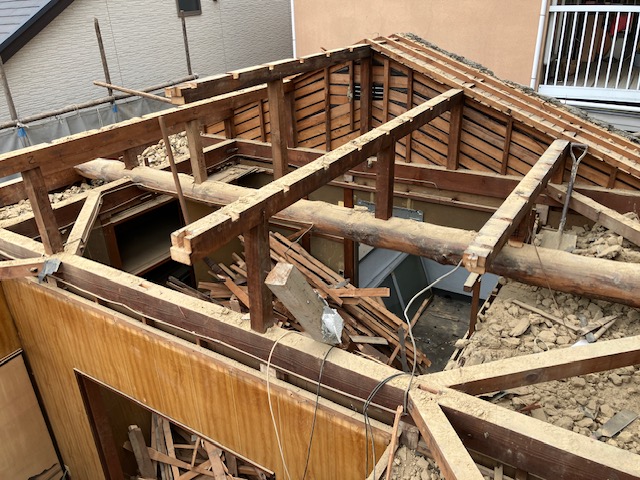 2階の天井をきれいに解体してから屋根を解体することで、作業がスムーズに進みます。