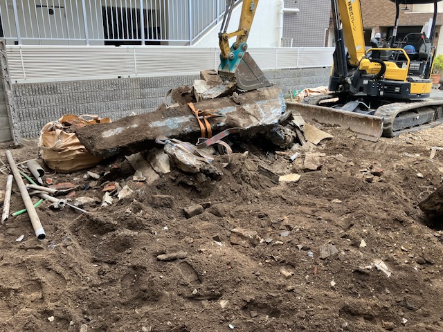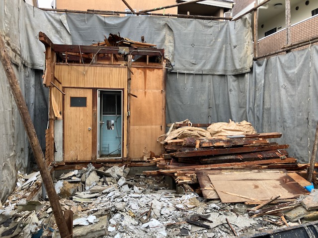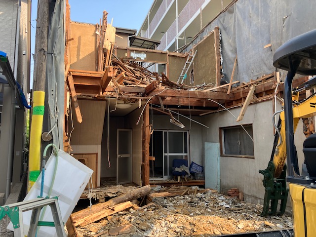 水回り部分が解体できたので、養生と足場を撤去して基礎部分を解体しているところです。