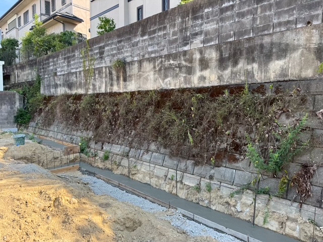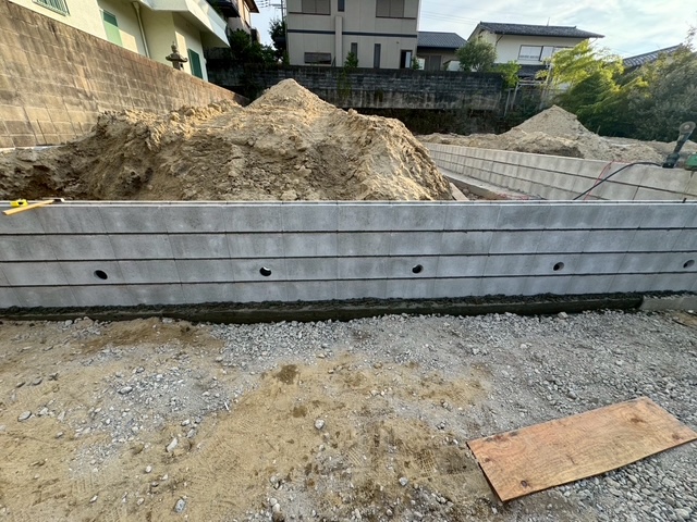 左手側より低くなる敷地境界なので、擁壁を設置していきます。