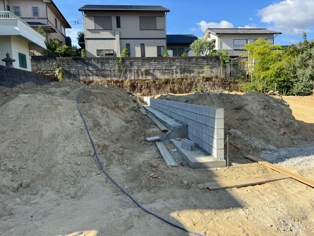 擁壁やブロックの施工が終わったので、指定されたレベル(高さ)まで宅盤を埋め戻しているところです。