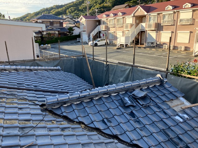 瓦屋根の住宅なので、瓦部分は手解体です。