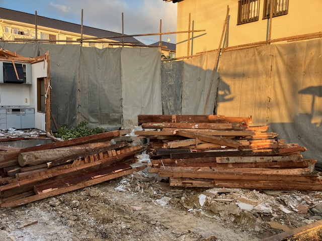 漆喰や瓦を固定していた桟(さん)を撤去して分別していきます。