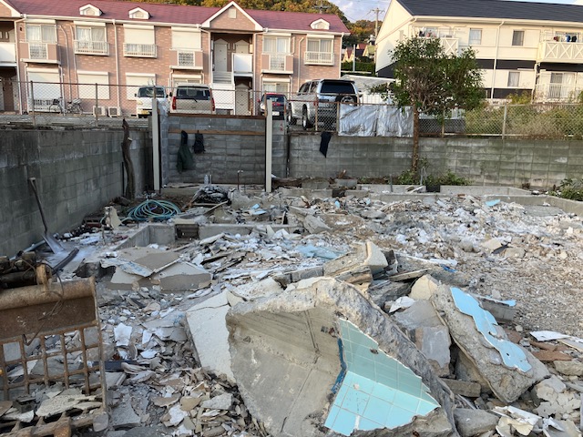 今回は作業車両を停める前面の道路が狭かったことと、基礎の近くに水道が通っていたこと、この2つに気を付けて解体工事を行いました。